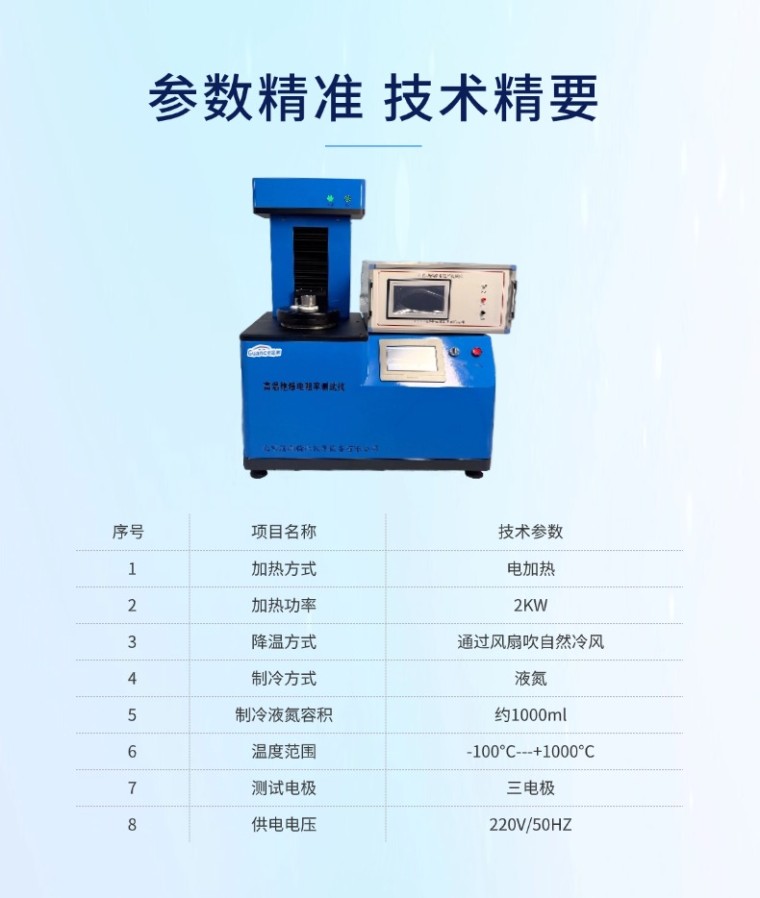高温绝缘电阻率测试仪 产品概述: 本仪器是一台通用高温绝缘电阻率测试仪器,可以适用于不同试样类型(片材/棒材/块体等)的绝缘材料电阻率测试。同时可以配套不同的试验套装,可以实现对不同高低温、真空及气氛环境下测试,满足客户多种测试需求,方便用户进行后期的拓展和延伸。本测量系统操作使用方便,电阻测量精度高,温度采集准确。 适用客户: 适用于计量院、第三方检测机构、科研院所、生产企业研发、质量品管检测等用户。 本仪器全套试验测控系统主要由以下四部分组成: ★高低温试验台 ★全自动绝缘电阻率测量仪 ★配套专用测试 ★高低温电阻率试验控制系统 一、高低温试验台 高低温试验台是通用试验设备,可以独立加热,也可以根据用户的需求,配备不同的测试工装和夹具,通过和不同的测试主机配套使用,可以用于高低温绝缘电阻率、高低温导体电阻率、高低温介电性能测试。 序号 项目名称 技术参数 备注 1 加热方式 电加热 2 加热功率 2KW 3 降温方式 通过风扇吹自然冷风 4 制冷方式 液氮 5 制冷液氮容积 约1000ml 6 温度范围 -100℃---+1000℃ 温度范围可选 7 测试电极 三电极 8 测量电极尺寸 25mm 可按试样规格定制 9 控温精度 ±0.5℃ 10 试样尺寸 50mm 11 操作显示 7寸触摸屏 12 供电电压 220V/50HZ 12 外形尺寸 14 设备重量 约50KG |
