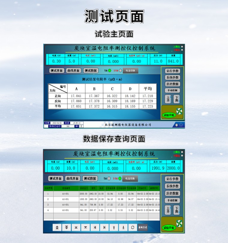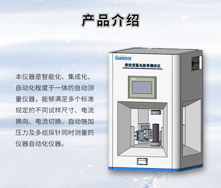 全自动炭块电阻率测试仪-10寸触摸屏 产品名称:全自动炭块电阻率测试仪 产品型号:GEST-210 参考标准:YST--63.2-2006 铝用炭素材料检测方法 GB/T 24525-2009 炭素材料电阻率测定方法 GB/T 24521-2018 炭素原料和焦炭电阻率测定方法 一、产品概述: 全自动炭块电阻率测试仪主要用于测量炭素材料炭块棒材电阻率的专用仪器. 本仪器是智能化、集成化、自动化程度于一体的自动测量仪器,能够满足多个标准规定的不同试样尺寸、电流换向、电流切换、自动施加压力及多组探针同时测量的仪器自动化仪器。 本仪器操作部分是10寸触摸屏,核心控制部分有西门子PLC完成,自动加载由高精密伺服电机施压,配备高精度传感器和恒流源,配备微型打印机,无需外接气源。 本仪器具有测量精度高、声音小、稳定性好、更换试样方便、页面操作简单等优势 仪器适用于炭素材料棒材、石墨电极等不同形状导体材料进行检测必备测试设备。 |