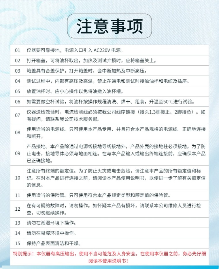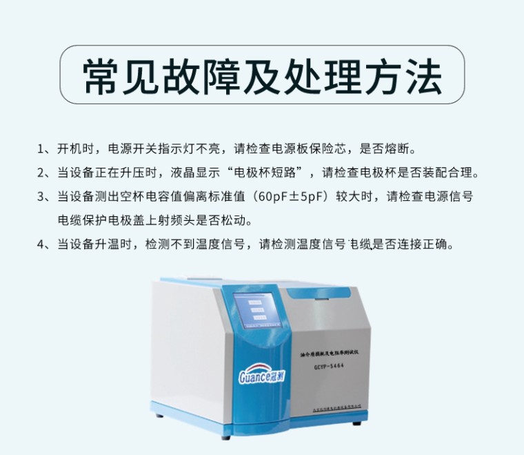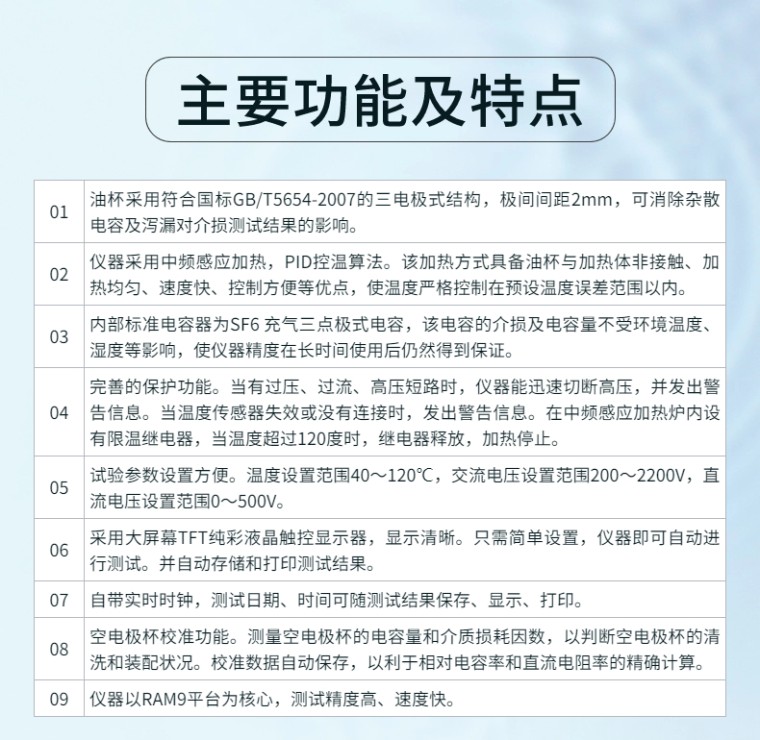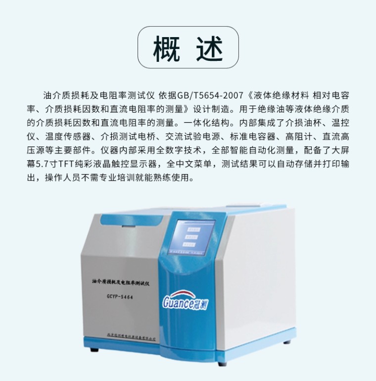 油介质损耗及电阻率测试仪 GCYP-5464 一、概 述 油介质损耗及电阻率测试仪 依据GB/T5654-2007《液体绝缘材料 相对电容率、介质损耗因数和直流电阻率的测量》设计制造。用于绝缘油等液体绝缘介质的介质损耗因数和直流电阻率的测量。一体化结构。内部集成了介损油杯、温控仪、温度传感器、介损测试电桥、交流试验电源、标准电容器、高阻计、直流高压源等主要部件。仪器内部采用全数字技术,全部智能自动化测量,配备了大屏幕5.7寸TFT纯彩液晶触控显示器,全中文菜单,测试结果可以自动存储并打印输出,操作人员不需专业培训就能熟练使用。 二、主要功能及特点 (1)油杯采用符合国标GB/T5654-2007的三电极式结构,极间间距2mm,可消除杂散电容及泻漏对介损测试结果的影响。 (2)仪器采用中频感应加热,PID控温算法。该加热方式具备油杯与加热体非接触、加热均匀、速度快、控制方便等优点,使温度严格控制在预设温度误差范围以内。 (3)内部标准电容器为SF6 充气三点极式电容,该电容的介损及电容量不受环境温度、湿度等影响,使仪器精度在长时间使用后仍然得到保证。 (4)完善的保护功能。当有过压、过流、高压短路时,仪器能迅速切断高压,并发出警告信息。当温度传感器失效或没有连接时,发出警告信息。 在中频感应加热炉内设有限温继电器,当温度超过120度时,继电器释放,加热停止。 (5)试验参数设置方便。温度设置范围40~120℃,交流电压设置范围 200~2200V,直流电压设置范围0~500V。 (6)采用大屏幕TFT纯彩液晶触控显示器,显示清晰。只需简单设置,仪器即可自动进行测试。并自动存储和打印测试结果。 (7)自带实时时钟,测试日期、时间可随测试结果保存、显示、打印。 (8)空电极杯校准功能。测量空电极杯的电容量和介质损耗因数,以判断空电极杯的清洗和装配状况。校准数据自动保存,以利于相对电容率和直流电阻率的**计算。 (9)仪器以RAM9平台为核心,测试精度高、速度快。 三、主要技术指标 电 源 电 压: AC 220V±10% 电 源 频 率: 50Hz/60Hz ±1% 测 量 范 围: 电容量 5pF~200pF 相对电容率 1.000~30.000 介质损耗因数 0.00001~100 直流电阻率 2.5 MΩm~20 TΩm 测 量 精 度: 相对电容率 ±(1~10)%读数 介质损耗因数 ±(5%读数±0.0002) 直流电阻率 ±10%读数 分 辨 率: 电容量 0.01pF 相对电容率 0.001 介质损耗因数 0.00001 测 温 范 围: 40~120℃ 温度测量误差: ±0.5℃ 交流实验电压: 200~2200V 连续可调,频率50Hz 直流试验电压: 0~500V 连续可调 功 耗: 500W 外 型 尺 寸: 460mm× 370mm×330mm 总 重 量: 25Kg 四、使用条件 环境温度: 0℃~40℃ 相对湿度: <75% |