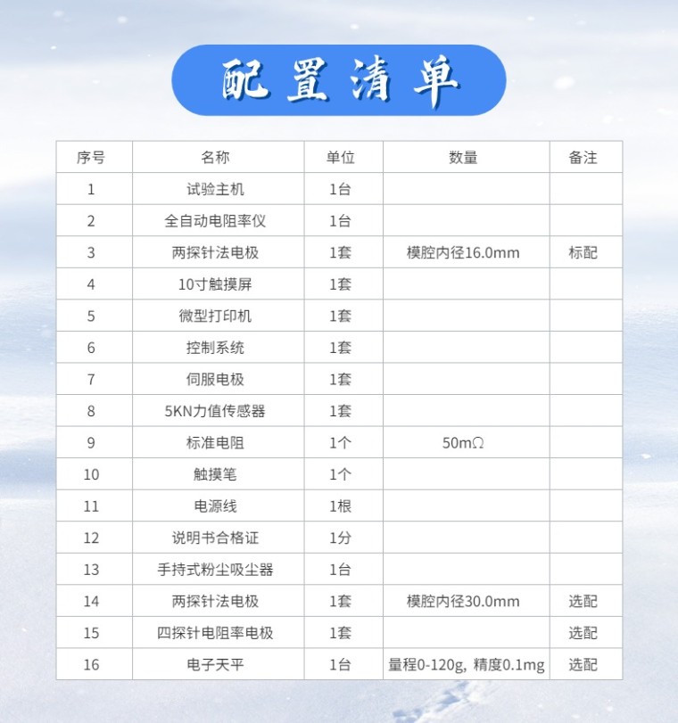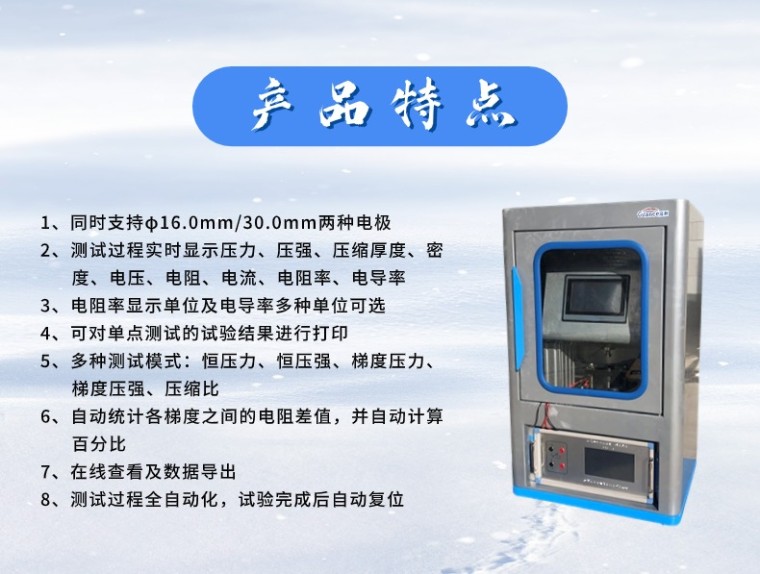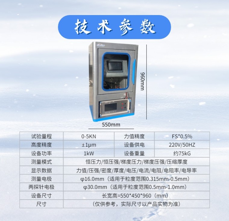 粉末电阻率测定仪(两探针法) GCFTDZ-I 参考标准: GBT 24521-2018 炭素原料和焦炭电阻率测定方法 产品用途: 本仪器用于炭素原料和焦炭粉末电阻率的测定 主要适用于煅后无烟煤、石墨、炭黑、焙烧碎、煅后石油焦、石墨化焦、针状焦等炭素生产用原料及焦炭粉末电阻率的测定 一、产品概述: 本仪器按照标准要求进行研发,主要工作原理是:用一定粒度的干燥试样,称重后倒入粉末料筒内,对粉末施加3.9MPA的压力,等压力稳定后,对粉末加载电流并测量电极两端电压,计算测出粉末电阻,并计算得到电阻率。 本仪器通过10寸触摸屏操作,西门子PLC控制,智能加载并保持恒压,压力和速度可调,真正实现了测试的智能化和自动化,无需人工干预,试验过程自动完成,试验完毕后自动回归到初始位,可对试验数据进行打印。 本仪器测量精度高,重复性误差小,试验过程自动化完成,设置页面合理,操作简单,操作人员无需通过专业技能培训即可操作,真正实现了一键式自动化测试。 本仪器具有测量精度高、稳定性好、结构紧凑、使用方便等特点,完全符合国际和国家标准的要求。 本仪器结构组成以下部分组成: 1、力值加载系统:由伺服电机为动力源进行加载,**控制压力,无噪音,连续加载 2、电阻测量系统:电阻测量范围宽,满足多种测试量程的需求 3、系统控制采集:10寸触摸屏进行控制操作,页面实时显示测试数据,并可以打印测试数据 4、专用测量电极:φ16.0mm/30.0mm 二、优势特点: 1、10寸触摸屏显示,支持远程升级 2、同时支持φ16.0mm/30.0mm两种电极 3、测试过程实时显示压力、压强、压缩厚度、密度、电压、电阻、电流、电阻率、电导率 4、电阻率显示单位及电导率多种单位可选 5、可对单点测试的试验结果进行打印 6、多种测试模式:恒压力、恒压强、梯度压力、梯度压强、压缩比 7、梯度多点测试结果,能够自动统计各梯度之间的电阻差值,并自动计算百分比 8、可以梯度模式测试的结果进行在线查看及数据导出 9、测试过程全自动化,试验完成后自动复位 测量模式: 模式选择 说明 备注 恒压力测试 在设定的恒定压力下测试,测试时间可设定 标准测试模式 恒压强测试 在设定的恒定压强下测试,测试时间可设定 梯度压力测试 按照设定的步进压力进行测试,梯度保持时间可设定 拓展延伸测试模式 梯度压强测试 按照设定的步进压强进行测试,梯度保持时间可设定 压缩厚度测试 按压缩比的位移量进行测试,测试时间可设定 三、技术指标: 序号 技术指标 技术参数 备注 1 试验量程 0-5KN(3.9MPA/3.0MPA) 2 力值精度 FS*0.5% 3 加载方式 伺服电机-电动加载 4 测量模式 恒压力/恒压强/梯度压力/梯度压强/压缩厚度 5 显示数据 力值/压强/密度/厚度/电压/电流/电阻/电阻率/电导率 6 数据打印 带微型打印机,可打印数据 7 数据导出 可导出数据电子版 8 操控方式 10寸触控显示屏 9 负载设定 压力/压强可设定 10 试验速度 试验速度可设定 11 保持时间 可设定 12 零点校准 自动进行零点校准 13 自动复位 试验完成后自动复原到初始位 14 高度精度 ±1μm 15 手动上升下降 可以手动上升和下降,速度可设定 16 测量电极 φ16.0mm(适用于粒度范围0.315mm-0.5mm) 选配 17 两探针电极 φ30.0mm(适用于粒度范围0.5mm-1.0mm) 选配 18 设备供电 220V/50HZ 19 设备功率 1kW 20 设备尺寸 长宽高=550*450*960(mm) 21 设备重量 约75kG 22 放置方式 台式-桌面放置 电阻测量系统-技术参数 序号 技术指标 技术参数 备注 1 恒流源 10μA, 100μA, 1mA, 10mA, 100mA, 0.5A,1A, 10A 2 恒流源精度 ±0.5% 3 电压量程 2 mV、20 mV、200 mV、2V 4 电压精度 ±0.1% 5 测量范围 10-6---105Ω 6 分辨率 10-8Ω 7 测量精度 ±0.5% 8 显示方式 7寸触摸屏 9数据打印微型打印机 |