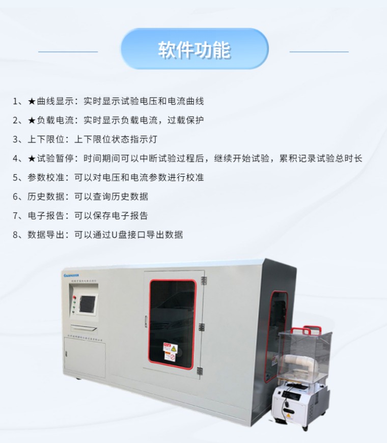 绝缘子伞套耐漏电及耐电蚀损试验箱 设备型号:NLD-AII 满足标准: GB/T 20142-2006 标称电压高于1000V的交流架空线路用线路柱式复合绝缘子---定义 、试验方法及接受准则 GBT 22079-2008 标称电压高于1000V使用的户内和户外聚合物绝缘子 一般定义、试验方法和接受准则 试验原理: 在一个封闭的盐雾室内,水平和垂直各放置一个绝缘子,对绝缘子施加工频高压,长期运行1000小时,判断工频高压及盐雾室对绝缘子的蚀损程度,及绝缘子的耐漏电概况,从而判断绝缘子是否合格。 设备组成: 高压发生器:主要由调压器和变压器组成,主要作用是升压和降压 雾化试验箱:主要由雾化室和超声波雾化器组成,在雾化室内,由超声波雾化器产生规定流量的雾化颗粒后,附着在绝缘子表面,形成露珠后,对绝缘子进行腐蚀。 控制系统:控制整个试验系统的开始、暂停和结束。 软件功能: 1、★曲线显示:实时显示试验电压和电流曲线 2、★负载电流:实时显示负载电流,过载保护 3、上下限位:上下限位状态指示灯 4、★试验暂停:时间期间可以中断试验过程后,继续开始试验,累积记录试验总时长 5、参数校准:可以对电压和电流参数进行校准 6、历史数据:可以查询历史数据 7、电子报告:可以保存电子报告 8、数据导出:可以通过U盘接口导出数据 技术参数: 1、输入电压:AC-220V ★2、输出电压:AC0~50KV,DC -50~0 KV可以调 3、电器容量:50KVA 4、电压试验精度:<2% 5、高压侧输出电流: ≥1A 6、高压侧输出电流:>250MA时,*大电压降<5% 7、电流测量精度:<1% ★8、门限位开关:打开门后,电压断电并自动归零 9、过流保护:可设定 10、试品离雾室顶的间距:>400mm, 11、试品离墙的间距:>400mm 14、试品数量:水平1只,垂直1只 15、试验时间:1000小时 ★16、喷雾方式:超声波雾化器 17、试样处的喷雾速度:3M/S 18、喷雾量为:(0.4±0.1)L/m3.H ★19、雾室容积:4m3(长宽高=2000mm*1200mm*1700mm) 20、喷雾液体: NaC1和去离子水配制好的盐水 ★23、雾化颗粒:5μm-10μm 24、控制系统:嵌入式工业计算机 ★25、主机尺寸:长宽高=3400*1300*1800(MM) 26、设备重量:300kG |