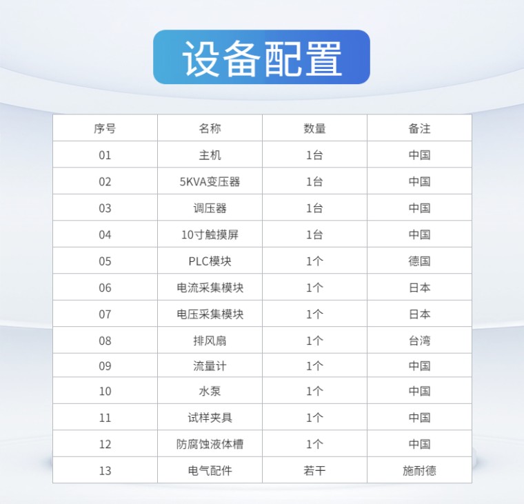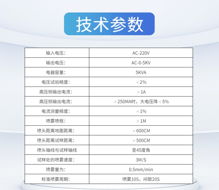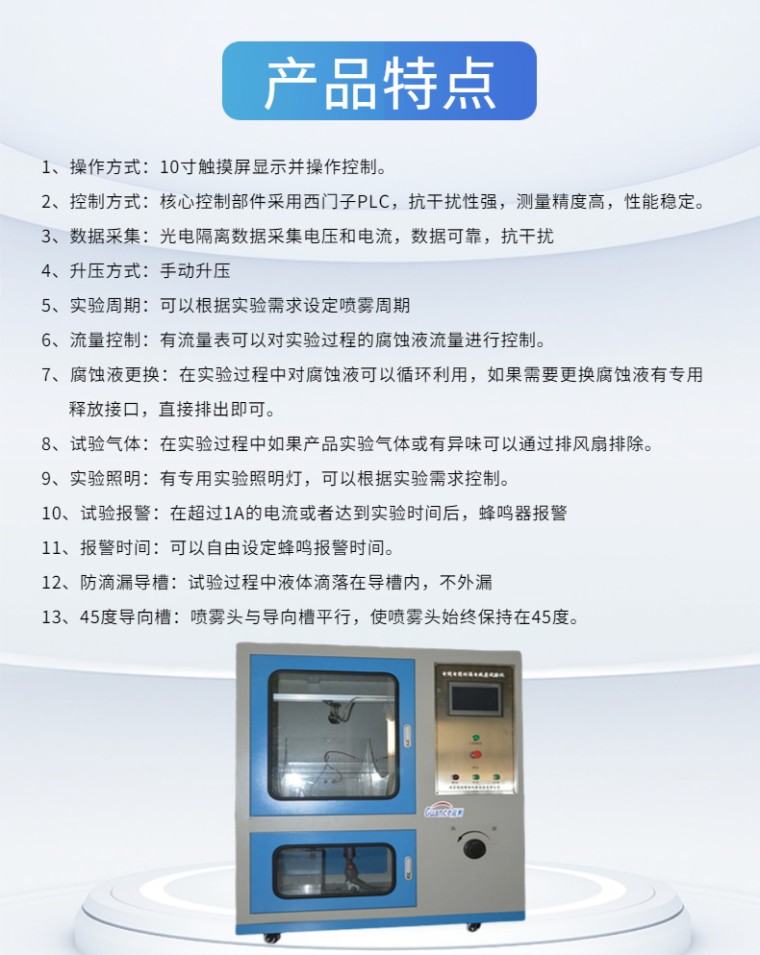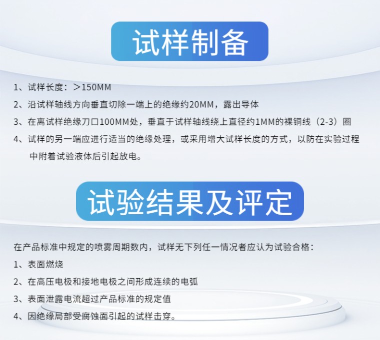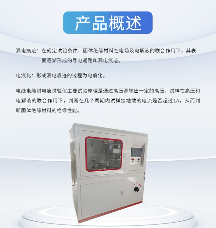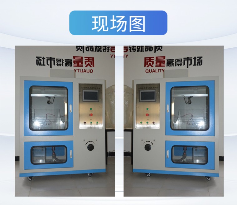 电线电缆耐电痕试验仪-触摸屏 设备名称:电线电缆耐电痕试验仪 设备型号:NLD-C 控制方式:触摸屏 满足标准: GB_T3048.7-2007电线电缆电性能试验方法_第07部分:耐电痕试验 产品概述: 漏电痕迹:在规定试验条件,固体绝缘材料在电场及电解液的联合作用下,其表面逐渐形成的导电通路叫漏电痕迹。 电痕化:形成漏电痕迹的过程为电痕化。 电线电缆耐电痕试验仪主要试验原理是通过高压源输出一定的高压,试样在高压和电解液的联合作用下,判断在几个周期内试样接地端的电流是否超过1A,从而判断固体绝缘材料的绝缘性能。 产品特点: 01、操作方式:10寸触摸屏显示并操作控制。 02、控制方式:核心控制部件采用西门子PLC,抗干扰性强,测量精度高,性能稳定,**可靠。 03、数据采集:光电隔离数据采集电压和电流,数据可靠,抗干扰 04、升压方式:手动升压 05、实验周期:可以根据实验需求设定喷雾周期 06、流量控制:有流量表可以对实验过程的腐蚀液流量进行控制。 07、腐蚀液更换:在实验过程中对腐蚀液可以循环利用,如果需要更换腐蚀液有专用释放接口, 直接排出即可。 08、试验气体:在实验过程中如果产品实验气体或有异味可以通过排风扇排除。 09、实验照明:有专用实验照明灯,可以根据实验需求控制。 10、试验报警:在超过1A的电流或者达到实验时间后,蜂鸣器报警 11、报警时间:可以自由设定蜂鸣报警时间。 12、防滴漏导槽:试验过程中液体滴落在导槽内,不外漏 13、45度导向槽:喷雾头与导向槽平行,使喷雾头始终保持在45度。 技术参数: 01、输入电压:AC-220V 02、输出电压:AC-0-5KV 03、电器容量:5KVA 04、电压试验精度:<2% 05、高压侧输出电流:>1A 06、高压侧输出电流:>250MA时,大电压降<5% 07、电流测量精度:<1% 08、喷雾喷程:>1M 09、喷头距离地面距离:>600CM 10、喷头距离试样距离:>500CM 11、喷头轴线与试样轴线呈45度角 12、试样处的喷雾速度:3M/S 13、喷雾量为:0.5mm/min 14、标准喷雾周期:喷雾10S,间歇20S 试样制备: 01、试样长度:>150MM 02、沿试样轴线方向垂直切除一端上的绝缘约20MM,露出导体 03、在离试样绝缘刀口100MM处,垂直于试样轴线绕上直径约1MM的裸铜线(2-3)圈 04、试样的另一端应进行适当的绝缘处理,或采用增大试样长度的方式,以防在实验过程中附着试验液体后引起放电。 试验结果及评定: 在产品标准中规定的喷雾周期数内,试样无下列任一情况者应认为试验合格: 01、表面燃烧 02、在高压电极和接地电极之间形成连续的电弧 03、表面泄露电流超过产品标准的规定值 04、因绝缘局部受腐蚀面引起的试样击穿。 |