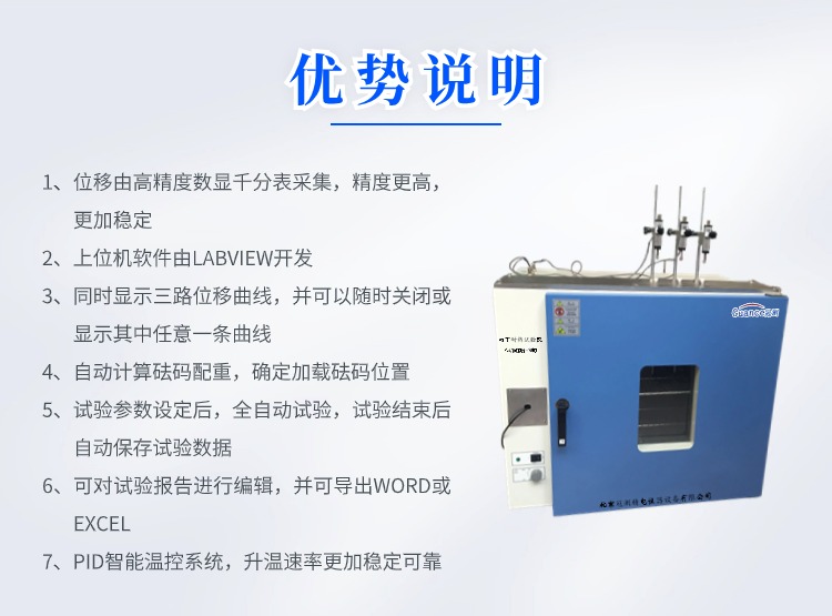 微机控制-马丁耐热试验仪 一 产品名称:马丁耐热试验仪-微机控制 二 产品型号:GCMDR-300 三 主要适用范围及功能: 制造标准:GB1699-2003 硬质橡胶 马丁耐热温度的测定 GB1035-70 塑料耐热性(马丁)试验方法 HG/T3847-2008硬质橡胶 马丁耐热温度的测定 可对塑料、尼龙、橡胶、电缆料等高分子材料进行耐热温度的测试。 工作原理: 把三组试样夹持好后并调整到规定的弯曲应力值5.0MPa,按照50±3℃/h升温速率加热,当试样的弯曲形变位移达到6mm后,记录温度值 优势说明: 1、位移由高精度数显千分表采集,精度更高,更加稳定 2、上位机软件由LABVIEW开发 3、同时显示三路位移曲线,并可以随时关闭或显示其中任意一条曲线 4、自动计算砝码配重,确定加载砝码位置 5、试验参数设定后,全自动试验,试验结束后自动保存试验数据 6、可对试验报告进行编辑,并可导出WORD或EXCEL 7、PID智能温控系统,升温速率更加稳定可靠 四 主要技术参数: 1. 恒温波动度:≤±2℃ 2. 等速升温速率为:50±3℃/h和10±2℃/12min 3. 温度分辨率:±0.1℃ 4. 试样尺寸:长-(120 mm±2mm) 宽-(15 mm±0.2mm) 厚-(10 mm±0.2)mm的条形试样,厚度大于 10mm者可双面加工为10mm 5. 试验负荷:50±0.2kgf/cm2 6. 试验温度范围:RT+10~300℃ 7. 试样弯曲有效长度:56±1mm 五 配置 1. 主机一台 2. 控制系统一套 3. 采集系统一套 4. 变形测量装置三套 5. 温度传感器一套 6. 测头三套 7. 砝码三套 8.计算机一套 9.彩色喷墨打印机一台(惠普) 10.内箱尺寸600*610*650mm 北京冠测是集业设计、开发、销售于一体的技术性 企业,注于新型材料试验机的研制、材料检测技术的提高及材料试验方法的**。 公司仪器研发部拥有行业内高效的研发力量及技术团队,长期与高校实验室合作,并联合研发沿的测试技术,是对推动我公司在材料检测技术的提高和试验方法**的重要技术保证力量。 公司主要致力于材料电性能、力学性能、燃烧性能、热物理性能、磨擦性能及行业用仪器的研发与销售,能够为客户进行业的检测实验室建设提供**解决方案 公司具有完善的是售后体系,产品销售国内并出口,质优价廉,得到客户的一致认可 |