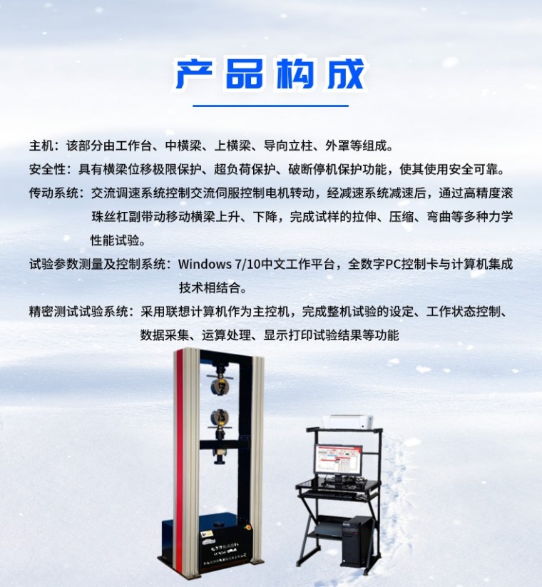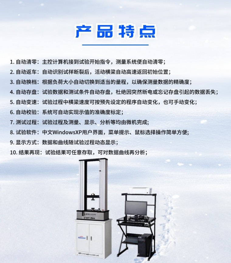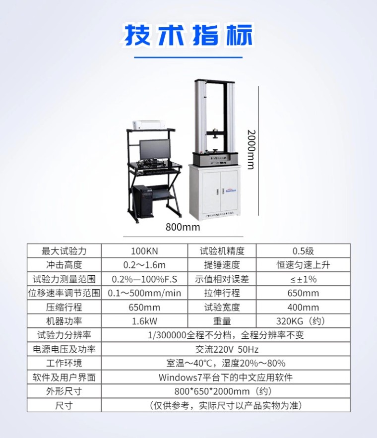微机控制电子万能试验机GCWDS-100KN 产品简介: WDS系列 微机控制电子拉力试验机的设计具有外形美观、操作方便、性能稳定可靠的特点。计算机经调速系统控制交流伺服电机转动,经减速系统减速后通过高精度滚珠丝杠副带动移动横梁上升、下降,完成金属、非金属试样的拉伸、压缩、弯曲、剪切等力学性能试验和分析研究。可自动求取抗拉强度、上下屈服强度、延伸率、非比例延伸强度(ReH、ReL、Rp0.2、Fm、Rt0.5、Rm、E)等试验参数,并可根据GB、ISO、DIN、ASTM、JIS等国际标准进行试验和提供数据。无污染、噪音低、效率高,具有非常宽的调速范围和横梁移动距离。主要用于检测钢铁、薄板薄带、铝合金、铜、钛合金以及非金属等材料,是厂矿企业、科研院所、质量监督等行业的理想检测设备。 该试验机采用调速精度高、性能稳定的交流伺服调速系统与交流伺服电机作为驱动系统;以Windows 7为操作平台的基于数据库技术的控制与数据处理软件采用了虚拟仪器技术代替传统的数码管、示波器,实现了试验力、试验力峰值、横梁位移、试样变形及试验曲线的屏幕显示,所有的试验操作均可以在计算机屏幕上以鼠标输入的方式完成,具有良好的人机界面,操作方便;插装在PC机内的双通道全数字程控放大器实现了真正意义上的物理调零、增益调整及试验力测量的自动调零和标定,无任何模拟调节环节,控制电路高度集成化,取消了电位器等机械调整器件,结构简单,性能可靠。 二.适用标准: GB/T 16491-2008《电子式万能试验机》; GB/T2611-2007《试验机通用技术要求》; GB/T228.1-2010《金属材料 拉伸试验 第1部分 室温试验方法》; 本试验机适用标准:GB、JIS、ISO、ASTM、DIN等; 本试验机根据GB/T13384-1999标准包装运输; 三. 主要构成及特点: 1主机:该部分由工作台、中横梁、上横梁、导向立柱、外罩等组成。该机为门式落地结构,上部空间拉伸下部空间压缩和弯曲,为上拉下压双空间结构。进口无间隙滚珠丝杠和导杠,造型美观,**可靠,而且保证主机具有足够的刚性和较高的同轴度等运行精度指标。 2**性:具有横梁位移极限保护、超负荷保护、破断停机保护功能,使其使用**可靠。 3传动系统:交流调速系统控制交流伺服控制电机转动,经减速系统减速后,通过高精度滚珠丝杠副带动移动横梁上升、下降,完成试样的拉伸、压缩、弯曲等多种力学性能试验。高精度精密滚珠丝杠加载平稳,效率高,滚动传递动力无噪音,定位精度高;圆弧齿形同步带减速系统,具有效率高、寿命长、噪音低、免维护、横梁上下运行无间隙等优点。 4试验参数测量及控制系统:Windows 7/10中文工作平台,全数字PC控制卡与计算机集成技术相结合,具有双通道信号放大、多路I/O、光电位移系统等多个单元,充分利用了计算机系统的多项软硬件资源,系统可靠,技术先进。 5精密测试试验系统 采用联想计算机作为主控机,完成整机试验的设定、工作状态控制、数据采集、运算处理、显示打印试验结果等功能,配有试验机专用Windows7/10中文版智能化软件包,可根据国家标准、国际标准或用户提供的标准测量和判断各种材料试件的各种性能参数,并对试验数据进行统计和处理;然后输出各种要求格式的试验报告和特性曲线图样。 1. 自动清零:主控计算机接到试验开始指令,测量系统便自动清零; 2. 自动返车:自动识别试样断裂后,活动横梁自动高速返回初始位置; 3. 自动换档:根据负荷大小自动切换到适当的量程,以确保测量数据的**度; 4. 自动存盘:试验数据和测试条件自动存盘,杜绝因突然断电或忘记存盘引起的数据丢失; 5. 自动变速:试验过程中横梁速度可按预先设定的程序自动变化,也可手动变化; 6. 自动校验:系统可自动实现示值的准确度标定; 7. 测试过程:试验过程及测量、显示、分析等均由微机完成; 8. 试验软件:中文WindowsXP用户界面,菜单提示、鼠标选择操作简单方便; 9. 显示方式:数据和曲线随试验过程动态显示; 10. 结果再现:试验结果可任意存取,可对数据曲线再分析; 11. 曲线遍历:试验完成后,可用鼠标找出试验曲线逐点的力值和变形数据,求取各种材料的试验参数方便实用; 12. 结果对比:多个试样特性曲线可用不同颜色迭加、再现、局部放大,实现一组试样的分析比较; 13. 曲线选择:可根据需要选择应力-应变、力-位移等曲线进行显示和打印; 14. 批量试验:对参数相同的试样,一次设定后可顺次完成一批试样的试验; 15. 试验报告:可按用户要求的格式对试验报告进行编程和打印. 主要技术指标 1.*大试验力:100KN 2.试验机精度:0.5级 3.试验力测量范围:0.2%—100%F.S 4.示值相对误差:≤±1% 5.试验力分辨率:1/300000全程不分档,全程分辨率不变 6.位移速率调节范围: 0.1~500mm/min; 7.拉伸行程:650mm 8.压缩行程:650mm 9.试验宽度:400mm 10.电源电压及功率: 交流220V 50Hz 11.机器功率:1.6kW 12.工作环境: 室温~40℃,湿度20%~80% 13.软件及用户界面:Windows7平台下的中文应用软件 14.外形尺寸800*650*2000mm(约) 15.重量:320KG(约) 系统主要配置 1.试验机主机 1台 2.松下伺服电机 1套 3.驱动器 1套 4.高精度负荷传感器(美国世铨) 1只 5.高精度滚珠丝杠 1副 6.精密减速系统 1套 7.精密测试系统 1套 8.试验机遥控盒 1套 9.计算机 (联想) 1台 10.HP打印机 1台 11.中英文控制专用软 1套 12.备份U盘 1个 13.技术资料: 包括: 试验机使用说明书、软件使用说明书、合格证、 装箱单1套 |