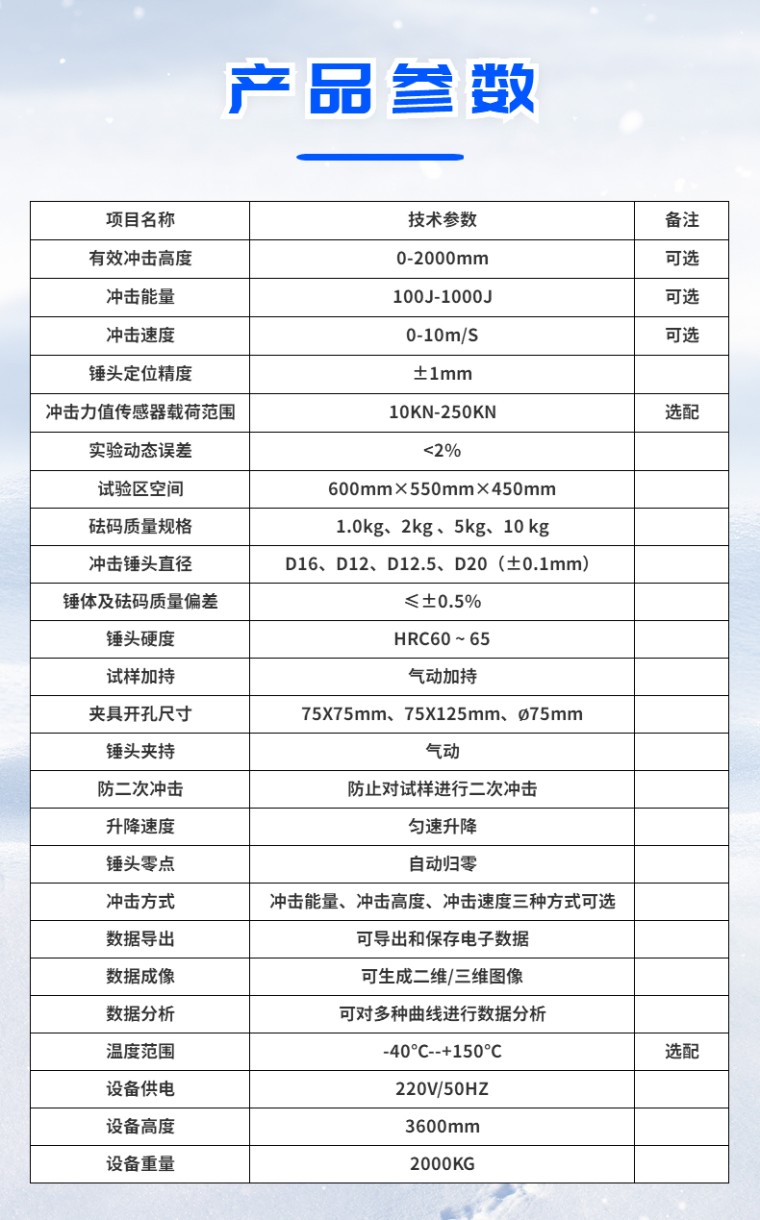 仪器化复合材料落锤冲击试验机 设备名称:仪器化复合材料落锤冲击试验机 设备型号:CLC-AI 一、满足标准: ISO 3127 ISO 6603 ISO7765 ISO11343 ISO8256 PREN6038 DIN 53373 ASTM D2444 ASTM D3763 ASTM D5628 ASTM D7136/D7136M-05 ASTM D7192 二、仪器概述: 本试验机主要测试材料的抗冲击能力,即通过一定质量的锤头在一定的高度自由下落对试样进行冲击,通过高速率同步采集锤头对试样冲击接触后的数据,分析试样的抗冲击能力及试样的损坏和断裂状态。 我公司生产的复合材料落锤冲击试验机,采用*新的传感器测控技术,能够实时采集落锤冲击板过程中的速度随时间变化曲线,利用瞬时*大冲击速度和*大反弹速度计算冲击动能和材料损伤时吸收的能量,通过软件数据分析,得到冲击载荷和和冲击点位移随时间变化曲线。 本复合材料落锤冲击试验机可以通过软件进行数据分析:*大冲击力、*大冲击能量、*大冲击速度、材料吸收能量及损伤耗散能量、损伤临界点及韧脆转变点……. 三、仪器优势说明 1、水平校准:主机可以水平调整,保证落锤的垂直度 2、数据有效:同时安装有冲击力传感器和加速度传感器,动态显示双趋势冲击图,对测试数据进行有效对比,便于对测试数据的有效性,进行判定 3、三维图形:能够对冲击点进行三维立体梯形模拟展示,更形象和直观 4、冲击形变:能够对锤头冲击试样过程中,对试样的冲击形变,进行模拟影像回放,并可以计算出形变量数值 5、冲击速度:冠测自主开发的采集冲击速度光栅,响应时间0.5μs(市场上现有产品,响应时间无法满足测试需求) 6、数据采集:数据采集卡直接采集传感器的mv电压信号,采集速度更快,精度更高(如经过放大器后采集,会有延时,信号会失真) 7、核心部件:高速数据采集卡,美国NI,保证数据的稳定性和可靠性 8、冲击方式:可按冲击能量、冲击高度、冲击速度三种方式可选 四、技术指标: 01有效冲击高度0-2000mm可选 02冲击能量100J-1000J可选 03冲击速度0-10m/S可选 04锤头定位精度±1mm 05冲击力值传感器载荷范围10KN-250KN选配 06实验动态误差<2% 07试验区空间600mm×550mm×450mm 08砝码质量规格1.0kg、2kg 、5kg、10 kg 09冲击锤头直径D16、D12、D12.5、D20(±0.1mm) 10锤体及砝码质量偏差≤±0.5% 11锤头硬度HRC60 ~ 65 12试样加持气动加持 13夹具开孔尺寸75X75mm、75X125mm、∅75mm 14锤头夹持气动 15防二次冲击防止对试样进行二次冲击 16升降速度匀速升降 17锤头零点自动归零 18冲击方式冲击能量、冲击高度、冲击速度三种方式可选 19数据导出可导出和保存电子数据 20数据成像可生成二维/三维图像 21数据分析可对多种曲线进行数据分析 22温度范围-40℃--+150℃选配 23设备供电220V/50HZ 24设备高度3600mm 25设备重量2000KG 五、环形式冲击力传感器 1、0.05-1 mV/lbf 灵敏度 2、-51至121℃使用温度 3、谐振频率>500 kHz 4、冲击量程:50kN量程 5、线性误差:满量程±1%(10%~50%FS),逐点±2%(50%~100%FS) 六、进口高速采集卡 1、采集频率:2MHZ 2、内置数模转换器:≥16bit 3、频率响应:500KHZ 七、冲击加速度传感器 1、灵敏度:2pC/ m/s-2 2、频率响应:1~12000Hz 3、安装谐振频率:40kHz 4、线性:≤1% 5、*大可测加速度:5000g 八、电脑打印机配置: 1、计算机为:联想品牌机 2、打印机:HP喷墨打印机 |