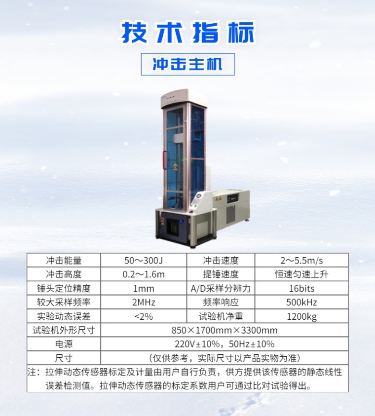 汽车胶粘剂冲击试验机 设备名称:汽车胶粘剂冲击试验机 设备型号:GCCLC-AII 一、满足标准: ISO 11343-2019 胶粘剂.冲击楔形条件下高强度粘结剂抗劈裂性的测定.楔形冲击法 GB∕T 36877-2018 结构胶粘剂冲击剥离强度的测定 楔形物法 二、仪器概述: 该设备是基于仪器化落锤锤冲击试验机所开发的,通过动态冲击楔形块切割两个金属片之间的高强度胶粘剂的方法,测定在冲击条件下高强度胶粘剂的动态抗断裂性能,是非金属材料生产厂家、质检部门必备的检测仪器,也是科研单位进行新材料研究不可缺少的测试仪器。 该设备采用力值传感器、测试系统,高速数据采集卡通过仪器化传感器测定出被冲击楔形块切割试样过程的载荷瞬态值,即冲击过程的力-位移-能量曲线及曲线上的特性点: 较大力Fm,冲击能量Wt和相应的位移,实现了对切割两金属片之间的高强度胶粘剂的过程分析,反映胶粘剂在动态冲击切割条件下的粘接性能。 我公司设备为成套设备供货,对技术、设备供货总负责,并对300J胶粘剂劈裂冲击试验机的完整性、可靠性、先进性**负责,对本设备的设计、制造、安装、调试、培训等方面承担总体技术责任。 三、技术指标 冲击主机 序号 项 目 技术参数 1 冲击能量 50~300J 2 冲击速度 2~5.5m/s 3 冲击高度 0.2~1.6m 4 提锤速度 恒速匀速上升 5 锤头定位精度 1mm 6 拉伸动态传感器较大载荷 20kN 7 拉伸动态传感器静态线性误差 满量程±1%(10%~50%FS) 逐点±2%(50%~100%FS) 8 A/D采样分辨力 16bits 9 较大采样频率 2MHz 10 频率响应 500kHz 11 实验动态误差 <2% 12 试验机外形尺寸 850×1700mm×3300mm 13 试验机净重 1200kg 14 电源 220V±10%,50Hz±10% 注:拉伸动态传感器标定及计量由用户自行负责,供方提供该传感器的静态线性误差检测值。拉伸动态传感器的标定系数用户可通过比对试验得出。 高低温箱技术参数 序号 项目 技术参数 1 温度范围 -40℃-100℃ 2 制冷方式 双压缩机 3 加热方式 电阻丝加热 4 温度偏差 ≤±2℃ 5 温度均匀度 ≤±2℃ 6 温控表精度 ±0.5℃ 7 箱体外尺寸 1510x550x1010 8 箱体内尺寸 240x200x450 9 电源 220V/4kW 锤体组件 项 目 技 术 参 数 1 锤体质量范围 20kg~50kg 2 质量增量 0.5kg 3 锤体和砝码质量误差 ±1% 4 砝码 0.5kg (×1) 1kg (×1) 2kg (×2) 5kg (×6) 外形尺寸图 此设备外形尺寸见下表和外形尺寸示意图: (单位:mm) 机型 外形尺寸AxBxC 外形尺寸AxDxC(含低温箱) 较大冲击高度H CLC-AII 860×860×3300 860x1650x3300 1500 |