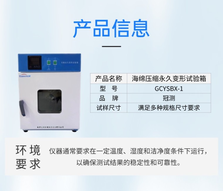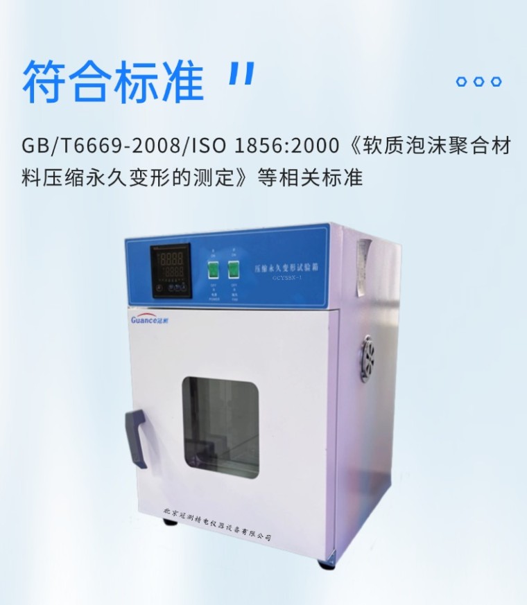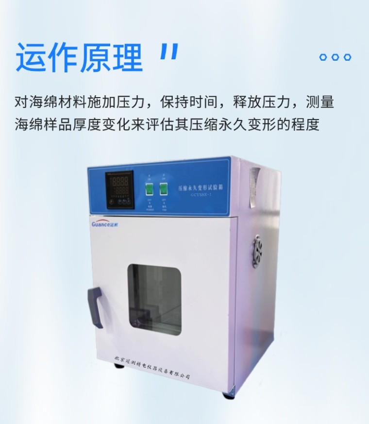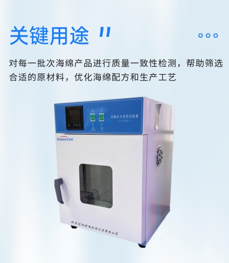 海绵压缩变形试验箱 GCYSBX-1 海绵压缩变形试验箱-作为一款专业用于测试海绵、泡沫等软质材料压缩性能的精密设备,广泛应用于材料研发、产品质量检测等多个领域。一、设备用途 1. 质量控制:在生产环节,试验箱可用于检测海绵产品在反复压缩或长期受压后的变形情况,确保产品弹性符合相关标准及实际使用需求。例如,对于床垫、沙发等家具使用的海绵,通过测试能保证其在日常使用中不会因过度变形而影响舒适度和使用寿命。 2. 性能评估:验证海绵材料的力学稳定性。通过模拟实际使用场景中的压缩条件,检测海绵在周期性压缩后的变形趋势,避免因材料变形导致产品功能失效,如防止因海绵变形造成过滤材料的通道堵塞、负压引流产品的负压失效等问题。 3. 研发优化:助力材料研发人员改进材料配方。试验箱提供的数据能帮助研发人员了解材料性能,进而优化配方,提升海绵的回弹性、耐用性等关键性能指标。 二、工作原理 试验箱主要通过加载系统、温度控制系统以及数据采集与处理系统协同工作。加载系统采用稳定且可调的压力施加方式,常见的如液压加载系统,由液压泵、液压缸、液压阀等部件构成,可模拟不同程度的实际压缩负载。测试时,将按标准尺寸裁剪好的海绵试样放置于夹具与定位块之间。夹具板通常由金属材料制成,表面平整光滑,确保试样在受压过程中均匀受力。定位块依据不同的压缩比。 三、核心功能 1. 压缩变形测试:按照相关标准,在规定压力、温度和时间条件下对海绵进行压缩,测试结束后测量卸载后的残余变形量,该数据直观反映海绵在特定工况下保持形状的能力,是评估海绵材料质量的重要指标之一。 2. 弹性回复率测试:通过测量海绵受压后恢复至原始厚度的比例,准确评估材料的弹性性能。高弹性回复率意味着海绵在多次使用后能更好地恢复原状,保持良好的使用性能。 3. 循环压缩疲劳测试:模拟海绵在实际使用中的多次压缩场景,检测其在周期性压缩后的变形趋势。通过长期循环测试,能够预测海绵材料在长期使用过程中的可靠性和耐用性,为产品的设计寿命提供数据支撑。 四、应用领域 1. 家具制造行业:床垫、沙发、座椅等家具产品大量使用海绵材料。试验箱可用于检测海绵的压缩强度、回弹性和耐久性,确保家具产品在长期使用过程中能够维持良好的舒适度和支撑性能,提升产品品质和用户满意度,增强企业在市场中的竞争力。 2. 包装材料行业:对于采用海绵作为缓冲包装材料的产品,如电子产品、精密仪器等的包装,通过测试海绵在不同压力下的压缩变形性能,能够优化包装设计,确保在运输、储存过程中产品得到有效保护,减少因包装材料性能不佳导致的产品损坏风险。 3. 材料研发机构:在新型海绵材料的研发过程中,试验箱提供的详细测试数据能够帮助研究人员深入了解材料性能,为材料配方优化、工艺改进提供科学依据,加速新型材料的研发进程,推动材料科学的发展。 4. 质量检测机构:作为专业的第三方检测设备,为市场上各类海绵产品的质量抽检提供准确可靠的测试服务。依据相关标准对产品进行严格检测,保障消费者权益,维护市场秩序,促进海绵产品行业的健康、规范发展。 |