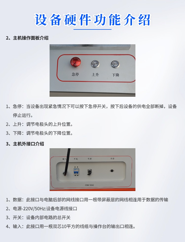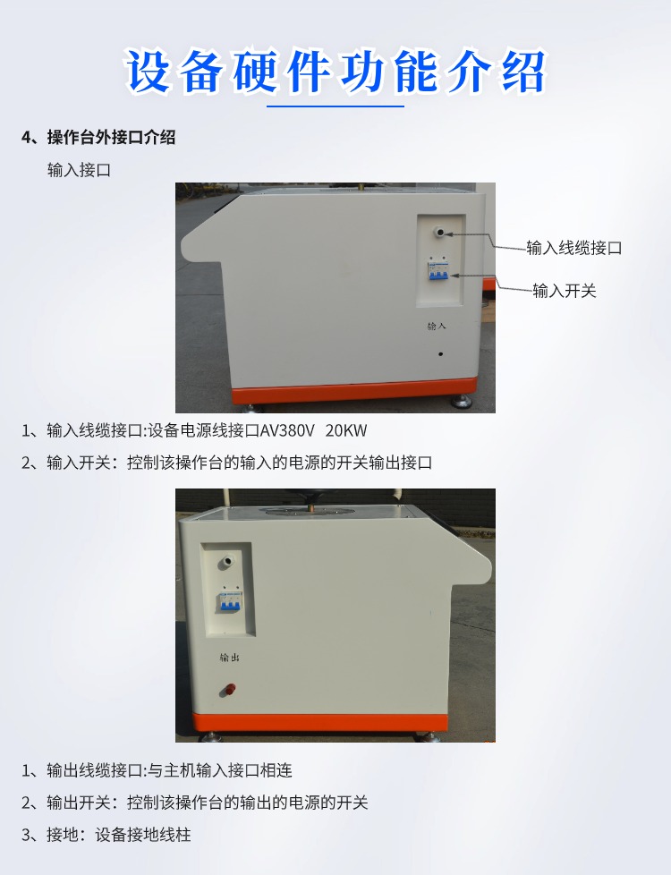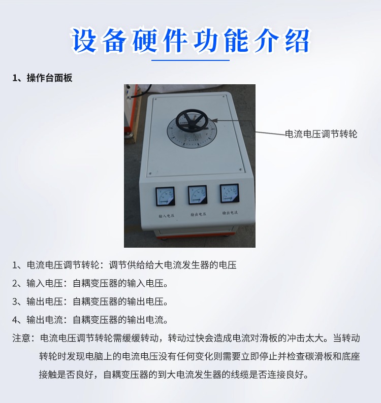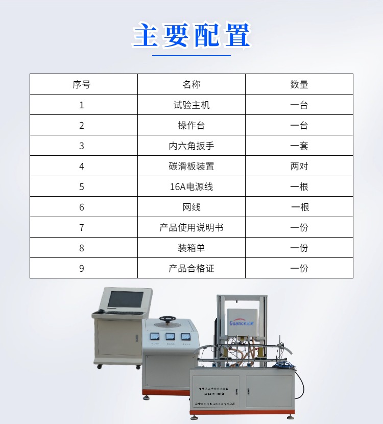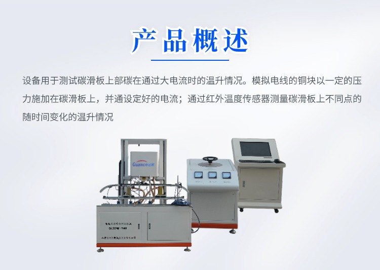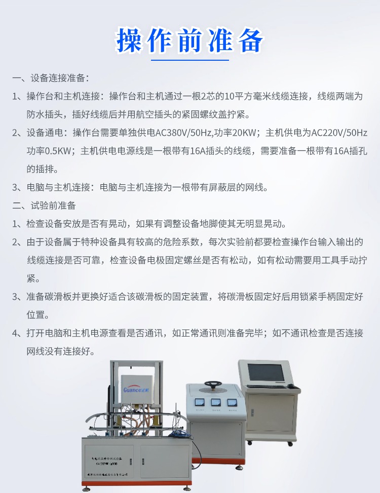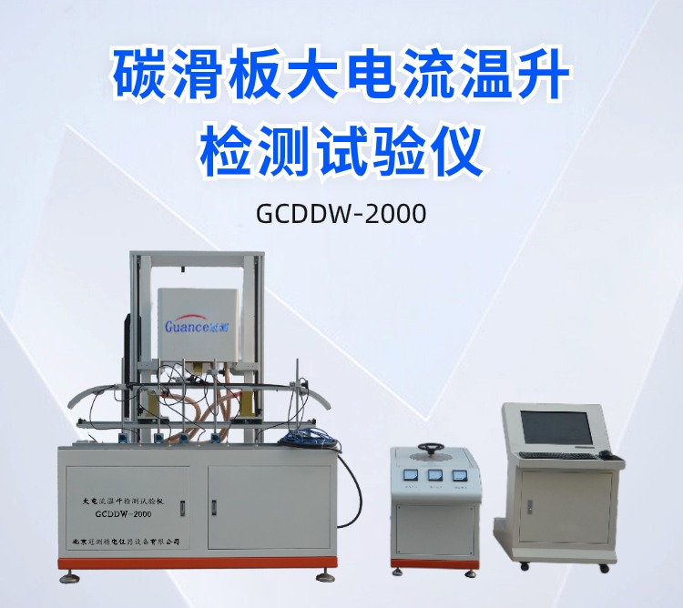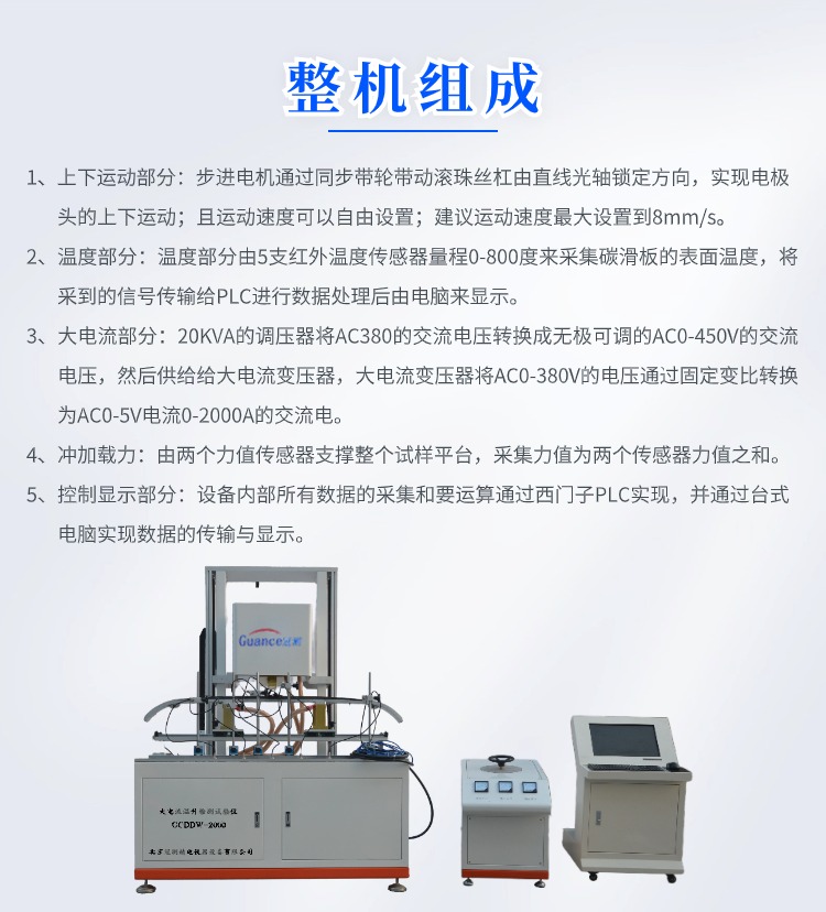 碳滑板大电流温升检测试验仪 GCDDW-2000 一、概述 设备用于测试碳滑板上部碳在通过大电流时的温升情况。模拟电线的铜块以一定的压力施加在碳滑板上,并通设定好的电流;通过红外温度传感器测量碳滑板上不同点的随时间变化的温升情况 二、技术指标: 1、输入电压:AC 380V 2、额定功率:30KW 3、上下运动行程:300mm 4、电流发生器额定电压:AC 5V 5、电流发生器额定电流:2000A 6、自耦变压器参数:输入 AC 380 V 输出 AV 0-450V 容量:20KVA 7、传感器量程:1KN 8、温度传感器量程:0-800度 9、设备外形尺寸:长1500mm 宽1000毫米 1980毫米 10、设备重量:500千克 三、整机组成: 1、上下运动部分:步进电机通过同步带轮带动滚珠丝杠由直线光轴锁定方向,实现电极头的上下运动;且运动速度可以自由设置;建议运动速度*大设置到8mm/s。 2、温度部分:温度部分由5支红外温度传感器量程0-800度来采集碳滑板的表面温度,将采到的信号传输给PLC进行数据处理后由电脑来显示。 3、大电流部分:20KVA的调压器将AC380的交流电压转换成无极可调的AC0-450V的交流电压,然后供给给大电流变压器,大电流变压器将AC0-380V的电压通过固定变比转换为AC0-5V电流0-2000A的交流电。 4、冲加载 力:由两个力值传感器支撑整个试样平台,采集力值为两个传感器力值之和。 5、控制显示部分:设备内部所有数据的采集和要运算通过西门子PLC实现,并通过台式电脑实现数据的传输与显示。 四、操作前准备: 1、设备连接准备: 1)操作台和主机连接:操作台和主机通过一根2芯的10平方毫米线缆连接,线缆两端为防水插头,插好线缆后并用航空插头的紧固螺纹盖拧紧。 2)设备通电:操作台需要单独供电AC380V/50Hz,功率20KW;主机供电为AC220V/50Hz功率0.5KW;主机供电电源线是一根带有16A插头的线缆,需要准备一根带有16A插孔的插排。 3)电脑与主机连接:电脑与主机连接为一根带有屏蔽层的网线。 2、试验前准备 1)检查设备安放是否有晃动,如果有调整设备地脚使其无明显晃动。 2)由于设备属于特种设备具有较高的危险系数,每次实验前都要检查操作台输入输出的线缆连接是否可靠,检查设备电极固定螺丝是否有松动,如有松动需要用工具手动拧紧。 3)准备碳滑板并更换好适合该碳滑板的固定装置,将碳滑板固定好后用锁紧手柄固定好位置。 4)打开电脑和主机电源查看是否通讯,如正常通讯则准备完毕;如不通讯检查是否连接网线没有连接好。 |