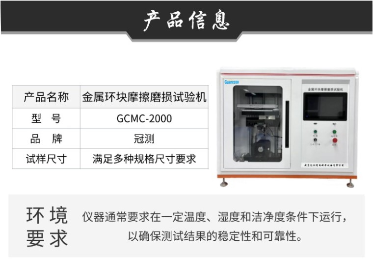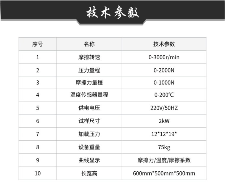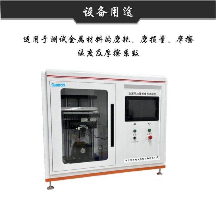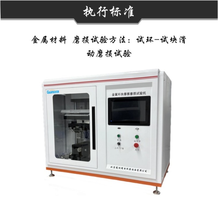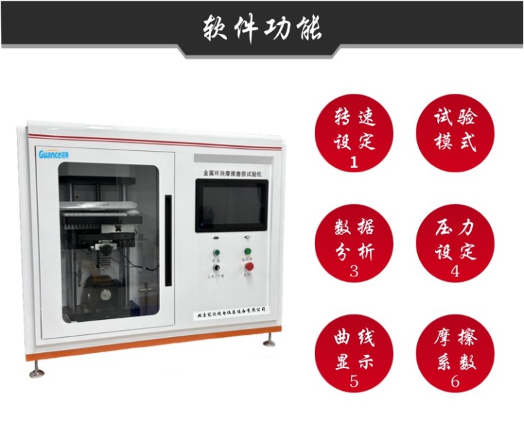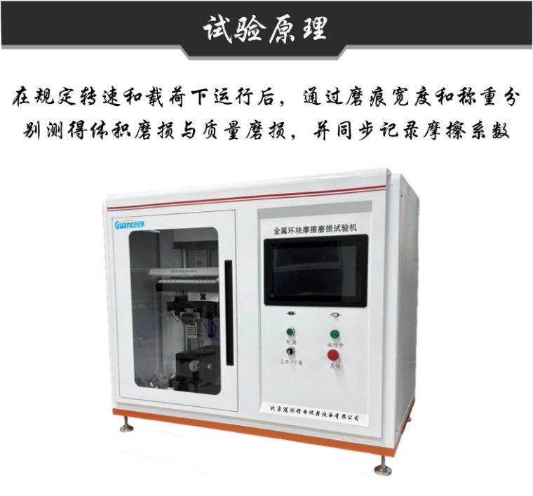 金属材料试环-试块滑动磨损试验机 GCMC-2000 执行标准:GB/T 12444-2006 金属材料 磨损试验方法:试环-试块滑动磨损试验 设备用途: 适用于测试金属材料的磨耗、磨损量、摩擦温度及摩擦系数 应用领域: 用于测试金属材料的摩擦性能测试,用于企业研发、科研研究、及第三方检测机构测试 试验原理: 试块与规定转速的试环相接触,并承受一定的试验力,经规定转数后,用磨痕宽度计算试块的体积磨损,用称重法测定试环的质量磨损。试验中连续测量试块上的摩擦力和正压力,并计算摩擦系数。 软件功能: 1、转速设定:可设定转数 2、试验模式:摩擦转数设定/摩擦时间设定 3、数据分析:可以采集分析试验中某时间段内的摩擦系数 4、压力设定:可设定压力 5、曲线显示:摩擦力、摩擦系数、磨擦温度、转速 6、摩擦系数:自动计算并实时同步显示 7、数据报告:可存储、导出、打印电子报告 技术参数: 序号 名称 技术参数 备注 01 摩擦转速 0-3000r/min 02 压力量程 0-2000N 03 摩擦力量程 0-1000N 04 温度传感器量程 0-200℃ 05 摩擦方式 干摩擦/湿摩擦 06 试样尺寸 12*12*19* 07 曲线显示 摩擦力/温度/摩擦系数 08 主轴径向圆跳动 ≤0.01mm 09 主轴轴向位移 ≤0.01mm 10 主轴轴线与工作台面平行度 ≤0.02mm 11 测试数据 体积磨损、质量磨损、磨擦温度、摩擦系数 12 供电电压 220V/50HZ 13 设备功率 2kW 14 长宽高 600mm*500mm*500mm 15设备重量75kg |