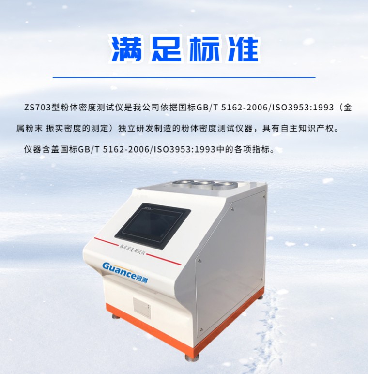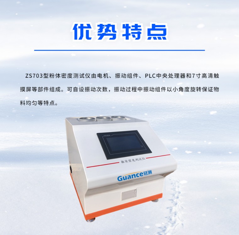 振实密度测试仪 产品型号:ZS703 一、概述 粉体密度是指单位体积的粉体所对应的质量。由于粉体中颗粒与颗粒之间或颗粒内部存在空隙(或孔隙),其粉体的密度通常小于所对应物质的真密度。振实密度是指将盛在容器中的粉体在规定的条件下被振实后的密度。 ZS703型粉体密度测试仪是我公司依据国标GB/T 5162-2006/ISO3953:1993(金属粉末 振实密度的测定)独立研发制造的粉体密度测试仪器,具有自主知识产权。仪器含盖国标GB/T 5162-2006/ISO3953:1993中的各项指标。 ZS703型粉体密度测试仪由电机、振动组件、PLC中央处理器和7寸高清触摸屏等部件组成。可自设振动次数,振动过程中振动组件以小角度旋转保证物料均匀等特点。 二、技术指标: 1、输入电压:AC 220V 2、功 率: 100W 3、 试样重量:≤500.00克; 4、 试样体积:≤250.00毫升; 5、 单次振动次数:0~14750次; 6、电机允许力矩:0.86 N.m; 7、 振动幅度:3mm, 8、重复性误差:≤1%; 9、准确性误差:≤1%; 10、一次*多做三组试验 三、试验环境要求 电源:交流220V ± 10%50Hz,35W。 相对湿度:小于85%,无凝结现象其它要求:环境整洁无烟尘,周围没有机械 振动源或电磁干扰源。 测试对象: 各种金属粉:如铝粉、锆粉、镍粉、钨粉、锡粉、锌粉、钼粉、镁粉、铜粉以及其它稀有金属粉、合金粉或金属氧化物粉末等。 各种非金属粉:如滑石粉、高岭土、碳酸钙、煤粉、荧光粉、水镁石、方解石、硅灰石、电气石、金刚石、重晶石、萤石 、沸石、碳化硼、黏土、石墨、石英、石膏、膨润土、硅藻土、硅酸锆、刚玉、云母、粘土、钛白粉等。 其它粉末:如土壤、染料、医药、农药、磨料、涂料、食品添加剂、催化剂、水泥、河流泥沙等。 四、整机组成: 振实密度是指一定量的粉体装填在特定容器后,以一定的频率和幅度进行振动,当粉末的体积不再减少时读出粉体的体积,然后用粉末的重量除以该体积就得到振实密度 1、试样容器:由量筒固定在振动台构成的整体振动容器。 2、执行机构:凸轮的旋转带轮振动台做上下运动,且振动台在下落的过程做自由落体运动,当振动台下落底部和金属直线轴承碰撞。 3、动力机构:由步进电机带动凸轮旋转,可实现**控制转速并试验壳对振动次数的**设定。 4、控制系统:由工业PLC通过预先编写好的试验程序并按照设定好的额参数来**运行, 5、操作系统:由7寸高清触摸屏和PLC通讯来实现整个操作系统,实现了可靠性、实用性和快捷性等多种**可靠便捷的仪器。 五、操作步骤: 1、试验前的准备: 1)准备量筒:根据样品选择一个合适的量筒,并将量筒清洗干净,然后晾干或进行干燥处理后。所选择的量筒的容积由样品的松装密度来决定,详见下表。 2)准备样品:用千分之一的天平称量样品,称量样品的量(m)由松装密度来定, |