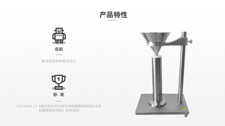 ZKMD-6609氧化铝松装密度测定仪 技术参数: 1、漏斗:直径100mm,锥度60º,漏斗颈长8 mm,下端出口内经6mm。 2、量筒: 约200cm3,内径与内高之比1:6,底座外径70mm,内底为平面 3、材质:不锈钢材质 4.环形漏斗架:在有支柱的坚固的底台上安装固定漏斗的环形架,长螺丝将环形架固定在支柱上,并可自由调节, 将漏斗装在高出圆筒型容器预定的水平面上 |
