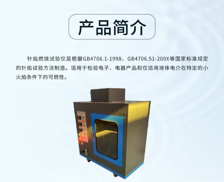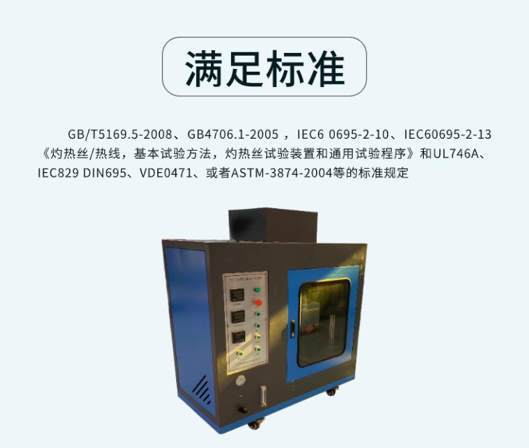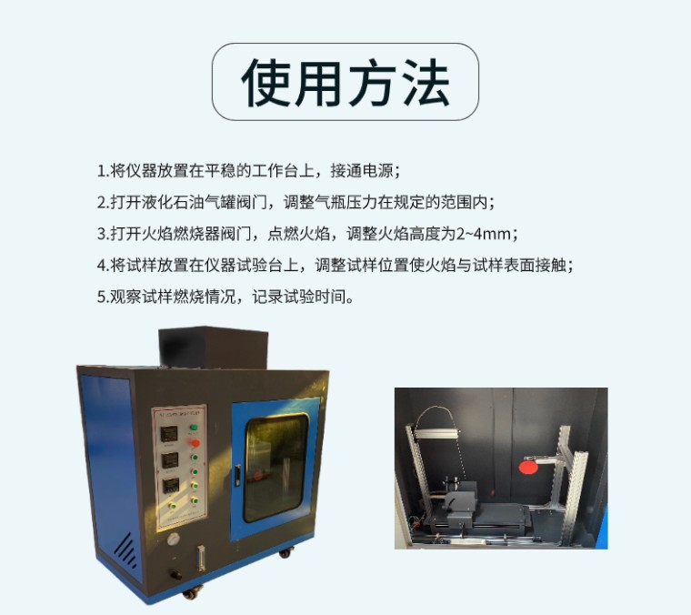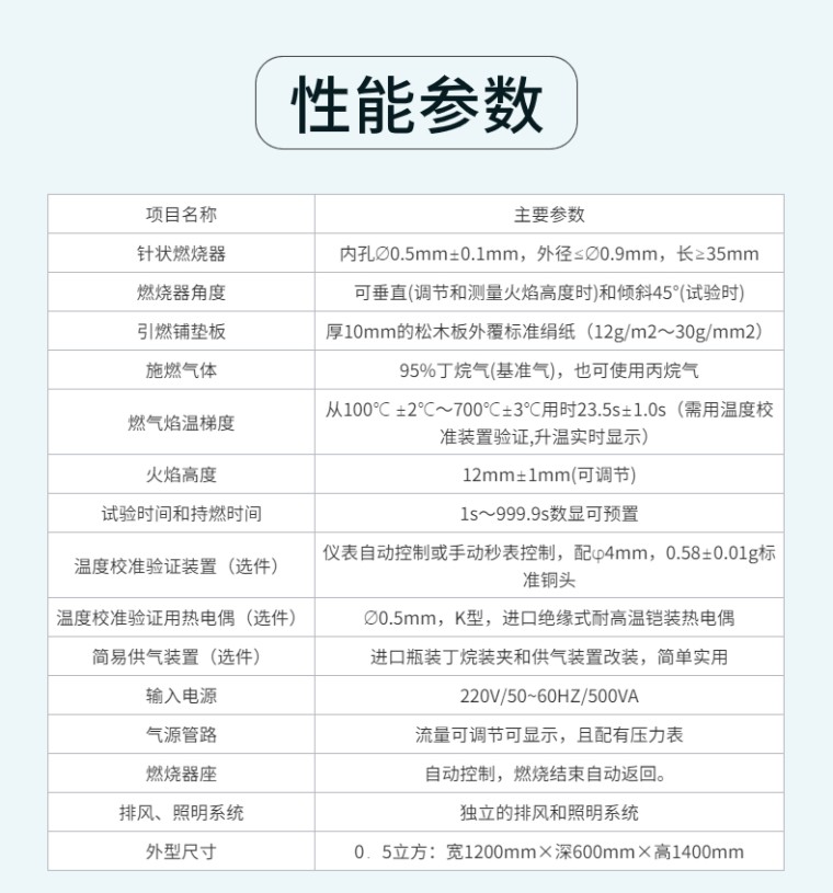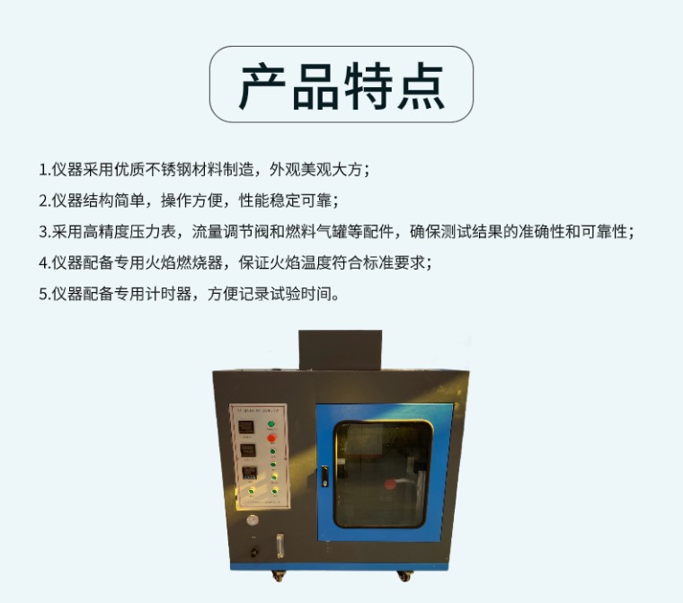 RSZY-A 针焰燃烧试验仪 一、产品简介 针焰燃烧试验仪是根据GB4706.1-1998、GB4706.51-200X等国家标准规定的针焰试验方法制造。适用于检验电子、电器产品和仅适用液体电介在特定的小火焰条件下的可燃性。 二、产品特点 1.仪器采用上等不锈钢材料制造,外观美观大方; 2.仪器结构简单,操作方便,性能稳定可靠; 3.采用高精度压力表,流量调节阀和燃料气罐等配件,确保测试结果的准确性和可靠性; 4.仪器配备专用火焰燃烧器,保证火焰温度符合标准要求; 5.仪器配备专用计时器,方便记录试验时间。 三、使用方法 1.将仪器放置在平稳的工作台上,接通电源; 2.打开液化石油气罐阀门,调整气瓶压力在规定的范围内; 3.打开火焰燃烧器阀门,点燃火焰,调整火焰高度为2~4mm; 4.将试样放置在仪器试验台上,调整试样位置使火焰与试样表面接触; 5.观察试样燃烧情况,记录试验时间。 四、满足标准 GB/T5169.5-2008、GB4706.1-2005 ,IEC6 0695-2-10、IEC60695-2-13《灼热丝/专线,基本试验方法,灼热丝试验装置和通用试验程序》和UL746A、IEC829 DIN695、VDE0471、或者ASTM-3874-2004等的标准规定 五、主要性能参数 针状燃烧器 内孔Ø0.5mm±0.1mm,外径≤Ø0.9mm,长≥35mm 燃烧器角度 可垂直(调节和测量火焰高度时)和倾斜45°(试验时) 引燃铺垫板 厚10mm的松木板外覆标准绢纸(12g/m2~30g/mm2) 施燃气体 95%丁烷气(基准气),也可使用丙烷气 燃气焰温梯度 从100℃ ±2℃~700℃±3℃用时23.5s±1.0s(需用温度校准装置验证,升温实时显示) 火焰高度 12mm±1mm(可调节) 试验时间和持燃时间 1s~999.9s数显可预置 温度校准验证装置(选件) 仪表自动控制或手动秒表控制,配φ4mm,0.58±0.01g标准铜头 温度校准验证用热电偶(选件) Ø0.5mm,K型,进口绝缘式耐高温铠装热电偶 简易供气装置(选件) 进口瓶装丁烷装夹和供气装置改装,简单实用 输入电源 220V/50~60HZ/500VA 气源管路 流量可调节可显示,且配有压力表 燃烧器座 自动控制,燃烧结束自动返回。 排风、照明系统 独立的排风和照明系统 外型尺寸 0.5立方:宽1200mm×深600mm×高1400mm |